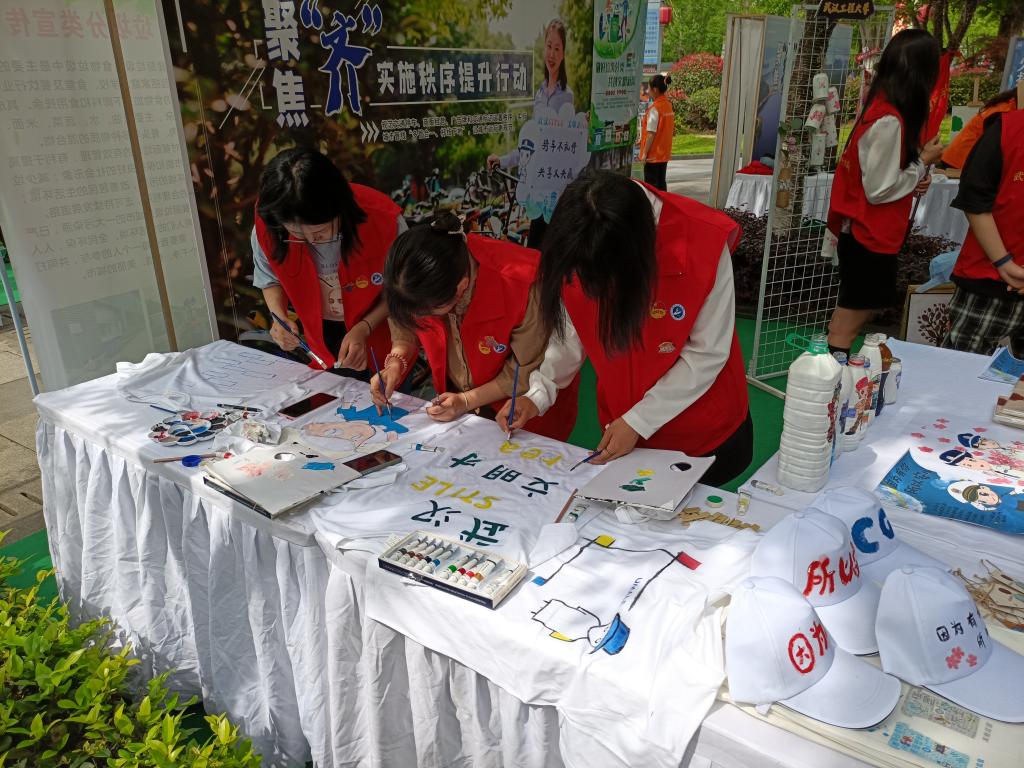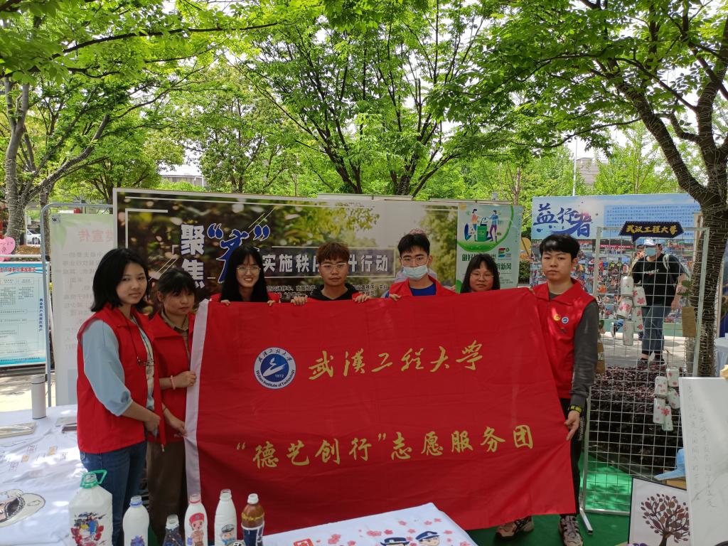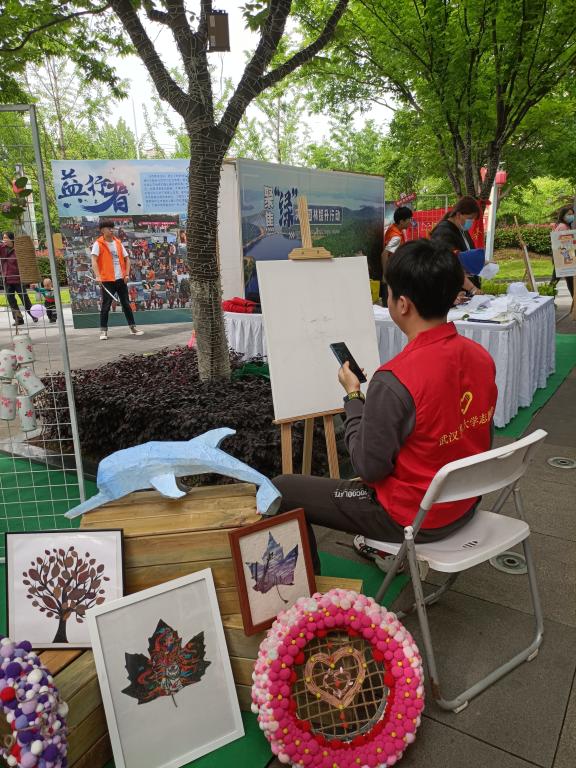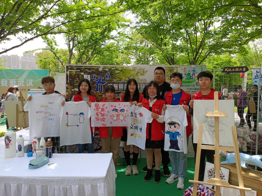 艺术设计学院青年志愿者协会“德艺创行”服务团代表武汉工程大学参与了本次活动。无论是前期准备的利用落叶、矿泉水瓶、易拉罐、损坏的轮胎等废弃物品制作成落叶画、风铃等精美的装饰品还是现场创作的以“因为有你·所以安心”的文创产品都受到了现场参观市民的点赞与好评。武汉市城市管理执法委员会宣传教育处处长叶志卫来到展位前详细地解了同学们的创作理念,给予了高度的肯定,他表示武汉工程大学的作品有温度、有力度、有美度。