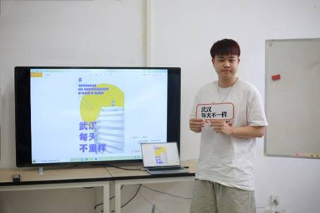通过小组讨论,同学们积极完成关键词的动态海报设计。经过激烈的头脑风暴之后,首先带来汇报分享的是来自武汉华夏理工学院的同学,小组选择的关键词是“武汉每天不一样”。该同学及其小组完成了两套方案,一边是柔和、尖锐与几何图形的碰撞;一边是根据与以往不同的玻璃材质来表现武汉的特色建筑物“黄鹤楼”,体现关键词的“武汉每天不重样”,选择在文案字体部分添加动效。