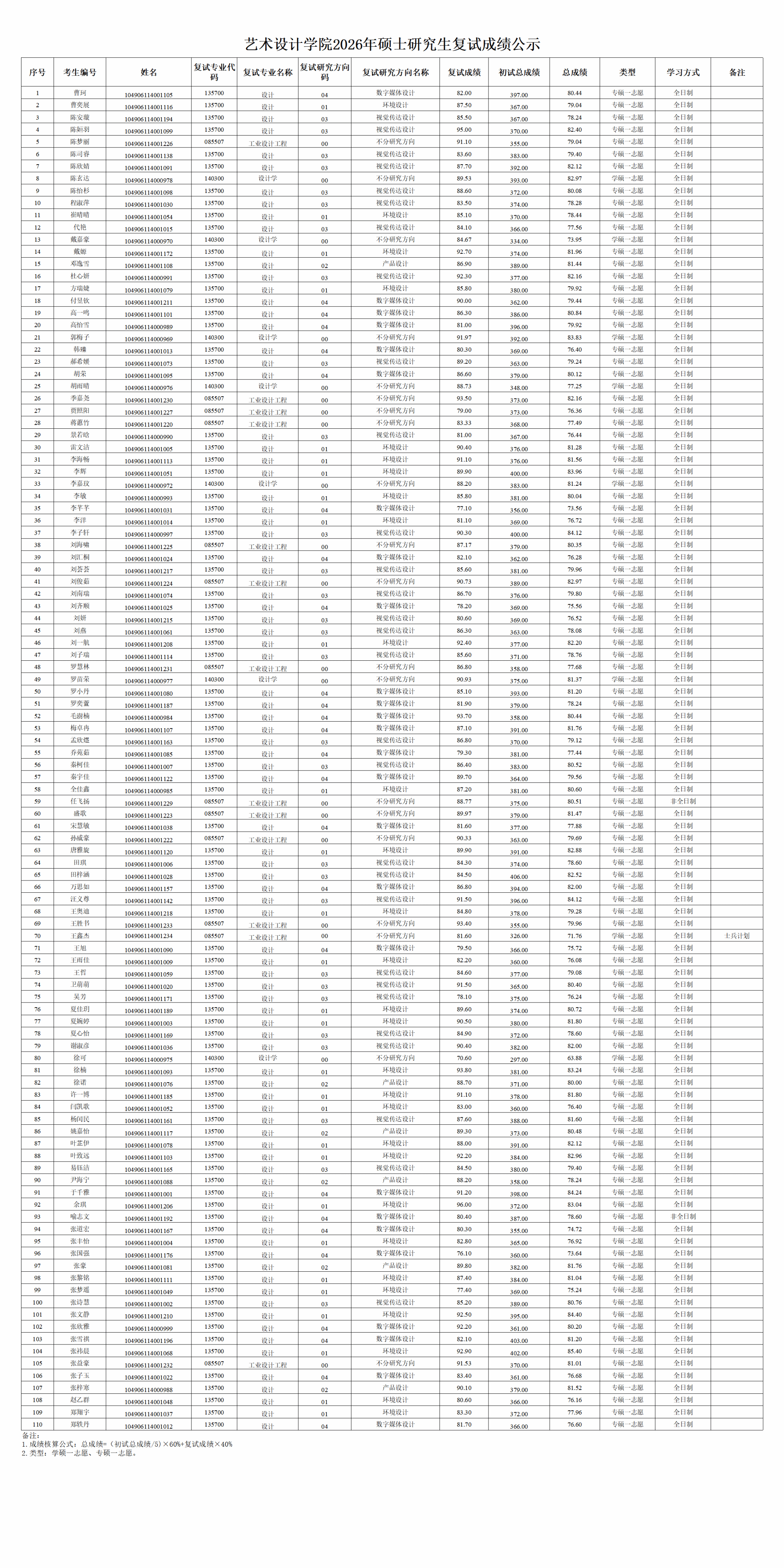 艺术设计学院2026年硕士研究生复试成绩公示
