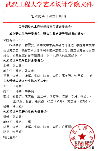 关于调整艺术设计学院学位评定委员会成立研究生培养委员会、研究生教育督导组成员的通知