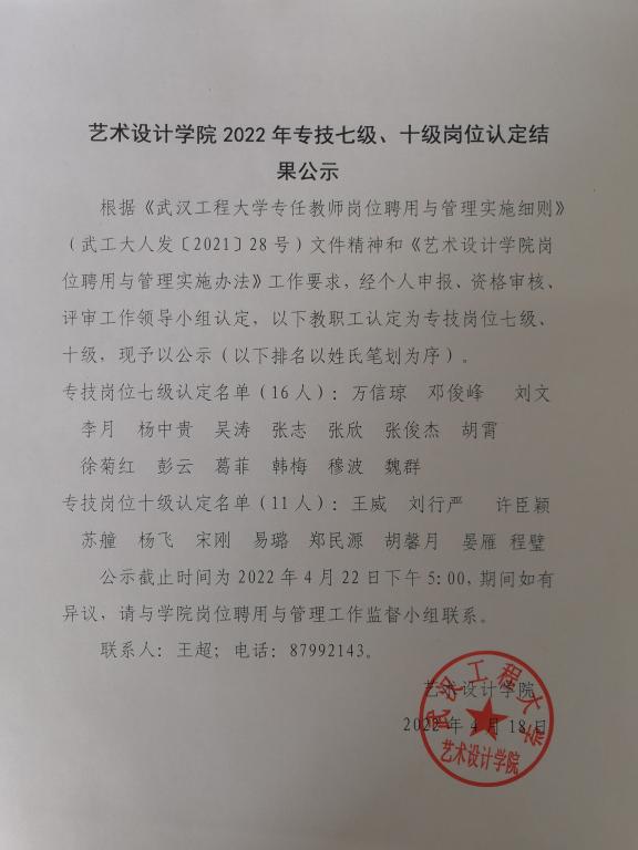 艺术设计学院2022年专技七级、十级岗位认定结果公示