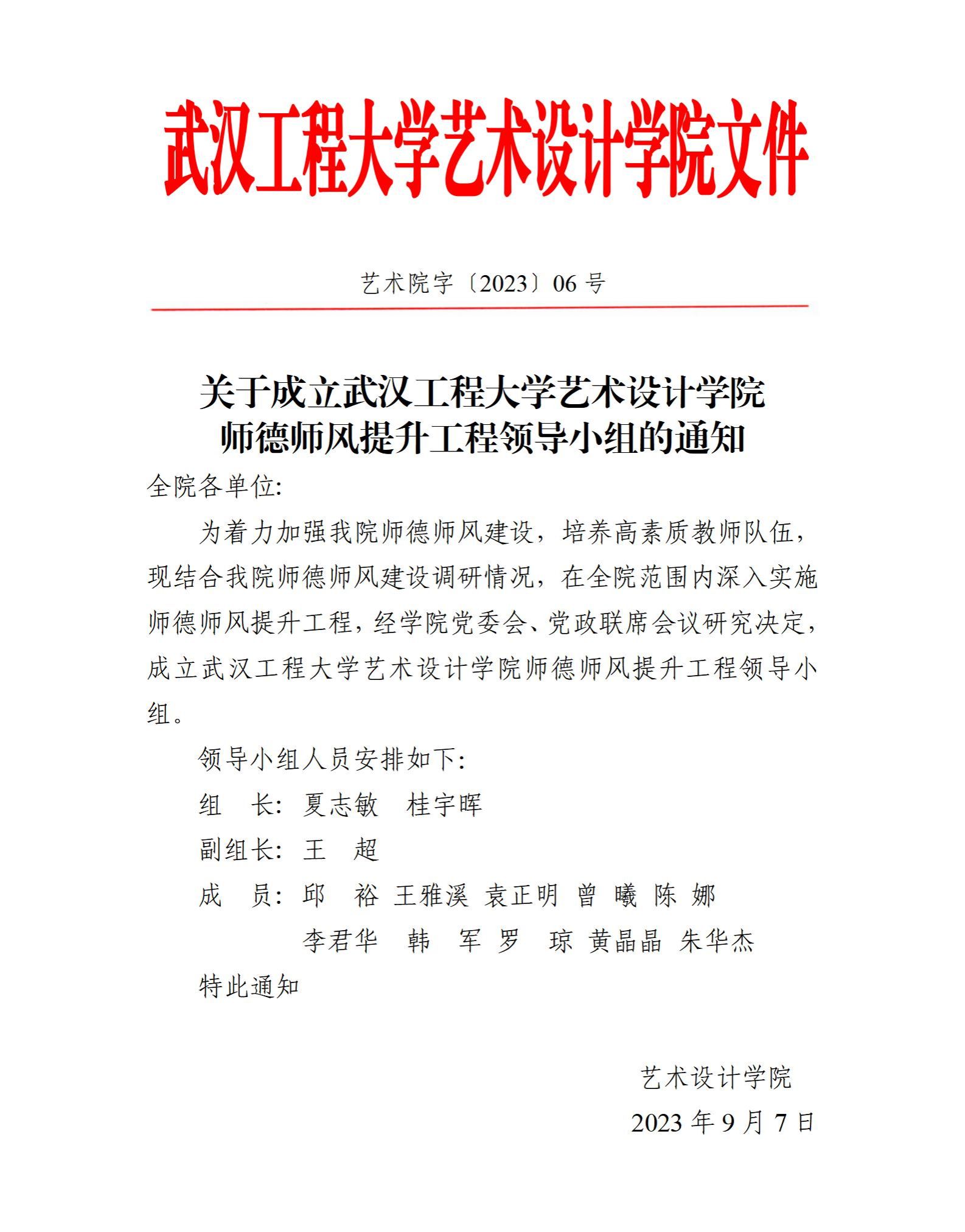 关于成立武汉工程大学艺术设计学院师德师风提升工程领导小组的通知