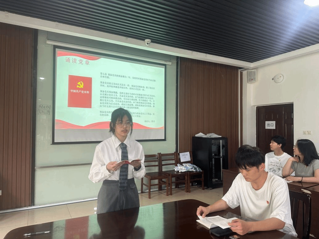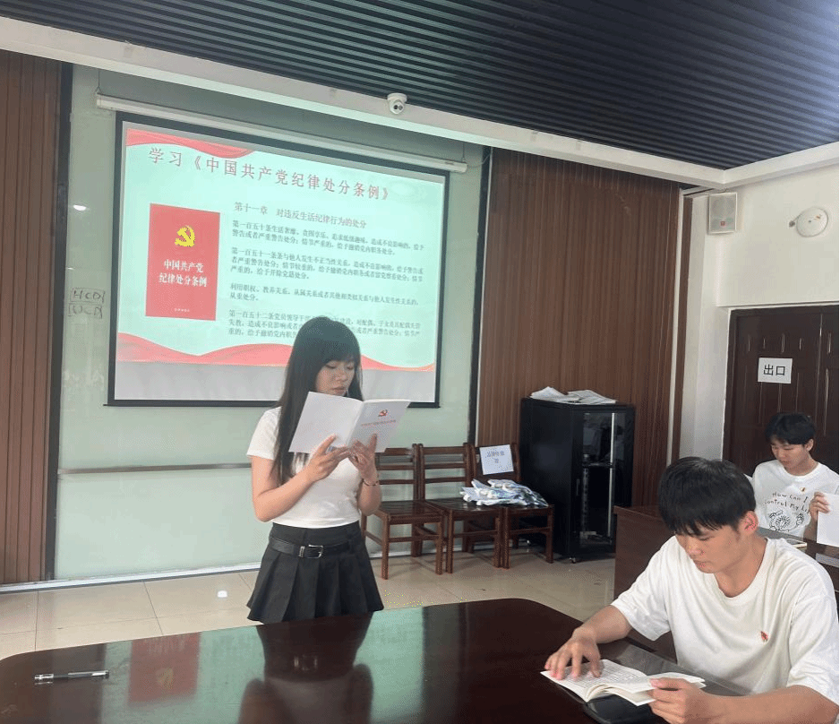 在理论学习环节,支部党员涂梓璇带领大家原原本本学习了新修订的《中国共产党纪律处分条例》“第十一章 对违反生活纪律行为的处分”部分。支部党员张飞雪以《知敬畏、存戒惧、守底线——做知行合一的大学生》为题,结合大学生党员的实际,分享了对《条例》的学习感悟,呼吁青年党员要始终将党纪要求铭记于心,自发地予以遵守,坚定地保持对党忠诚。在工作和生活中,把党纪当作准则,严格地约束自我,进而为党的伟大事业奉献自身力量。