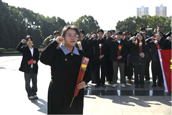 在黄麻起义和鄂豫皖苏区纪念园,全体人员整齐列队,庄严肃立。在烈士纪念碑前,敬献花篮,鞠躬默哀,表达对先烈的深切哀思与崇高敬意。在学生党员张珂莹的带领下,全体党员干部面向党旗和纪念碑,庄严宣誓,重温入党誓词。