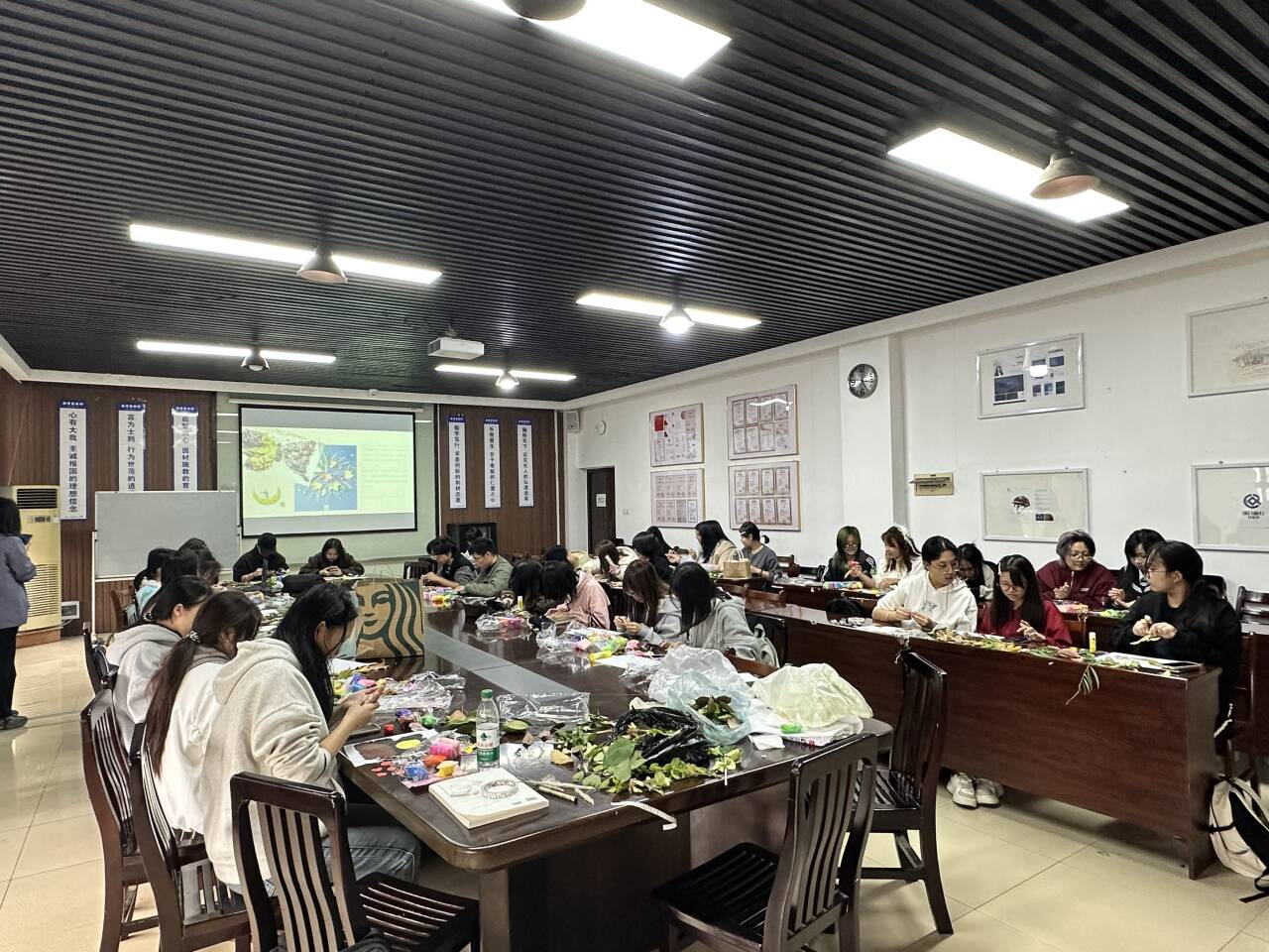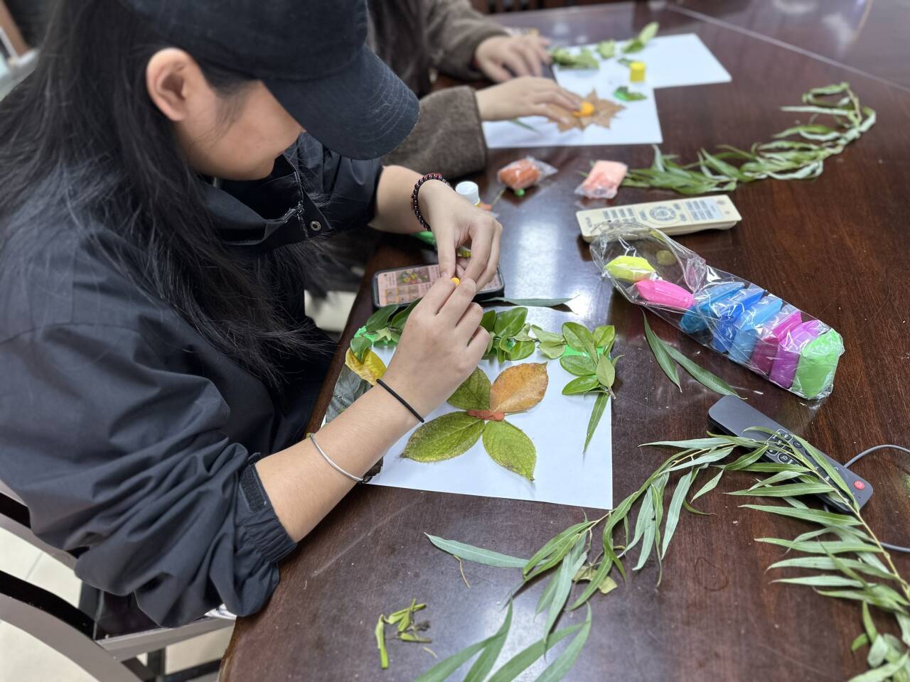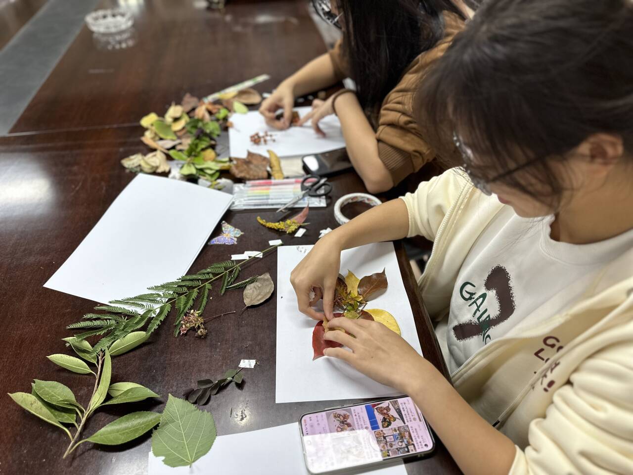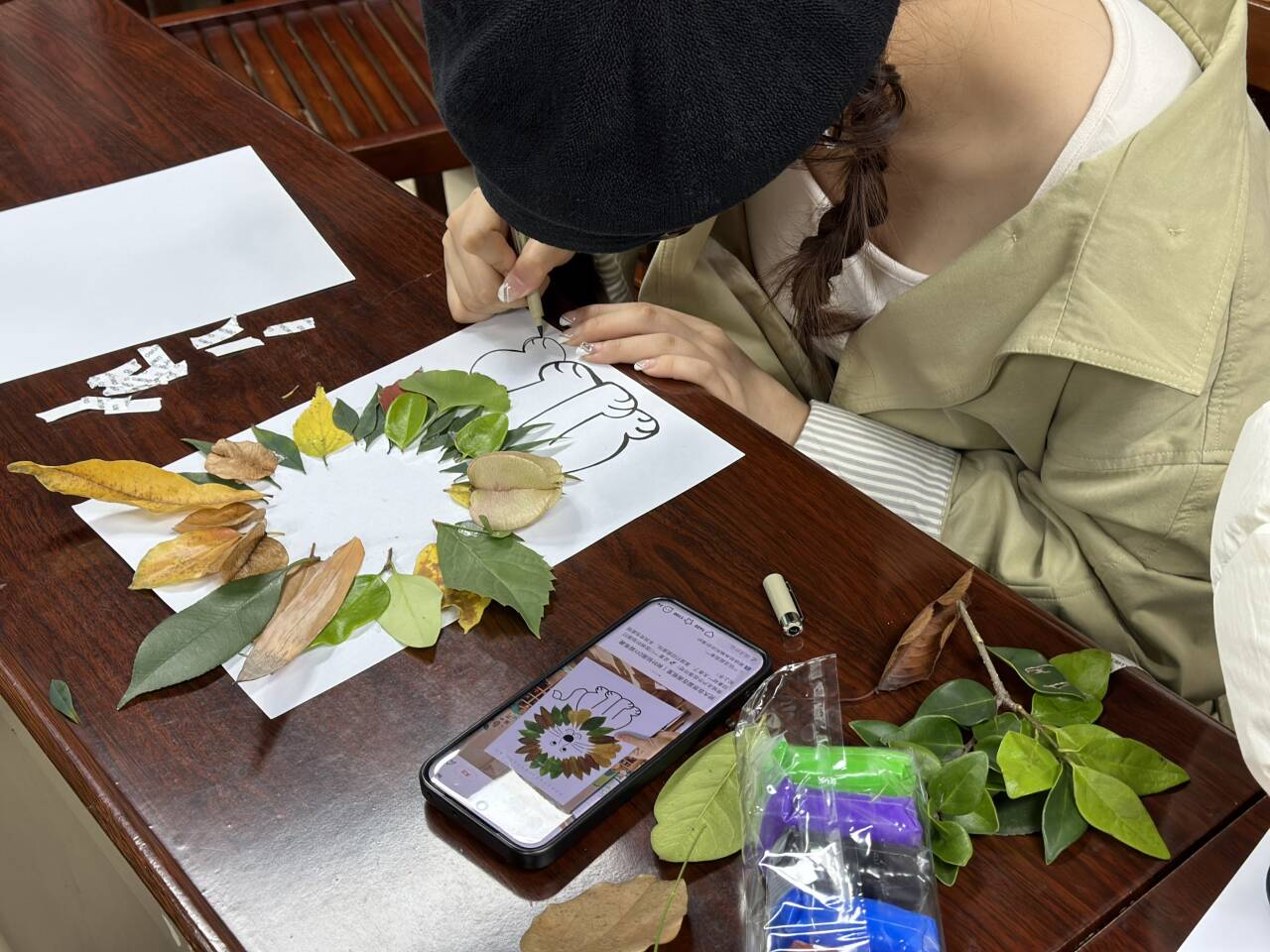 人在接触自然元素时,压力便会随之降低,获得天然的疗愈力。活动过程中,同学们捻起叶片,指尖翻转如蝶翼,将错落的叶形叠搭、相倚,组合成别出心裁的秋日心景。没有固定模板的束缚,没有千篇一律的要求,大家将心底的言语注入叶片之中,让原本乏味的枯枝落叶成为了承载心事与风景的艺术形式。