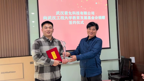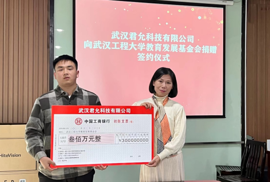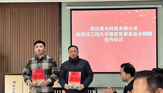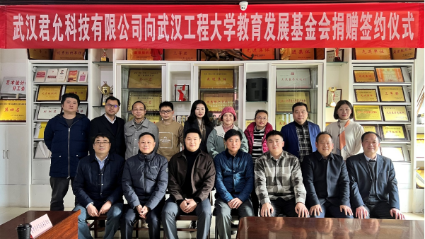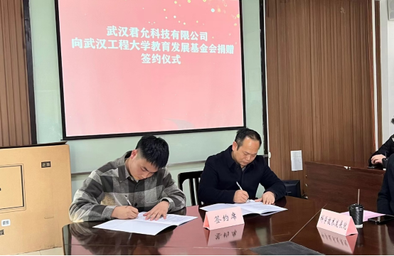 本网讯(通讯员:罗琼,审核员:夏志敏,邓新洲)12月23日下午,武汉君允科技有限公司向学校捐赠300万用于“场景化教学与工业化制造虚拟仿真研究中心”项目建设,签约仪式在艺术设计学院会议室举行。武汉工程大学正校级干部、学校基金会理事长叶芃,我校2014级工业设计专业毕业的杰出校友、企业总经理程根,市场总监樊星出席仪式,仪式由学校基金会秘书长邓新洲主持。