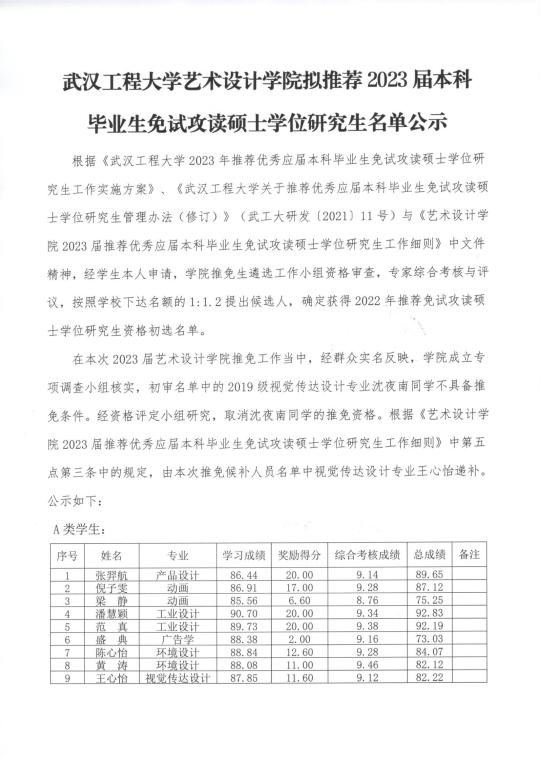 武汉工程大学艺术设计学院拟推荐2023届本科毕业生免试攻读硕士学位研究生名单公示