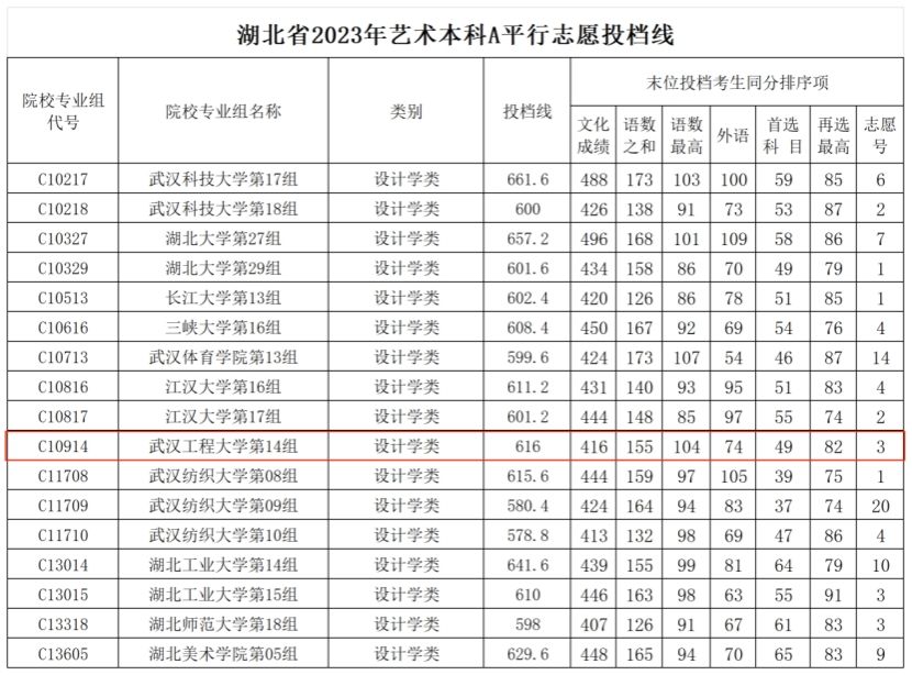 7月13日,湖北省招生办公室发布了湖北省2023年艺术本科A平行志愿投档线。从录取结果上看,2023年我校第14组设计学类录取投档分为616分 ,高出湖北省本科艺术投档线112.4分,最低排位3327名,相较去年提升了373个位置值;最高分655.6分,最高排位1235名,相较去年提升了1035个位置值。值得一提的是,最低分在去年提升300位置的基础上又提升了373,同比增长24.3%,在湖北省属高校中名列前茅。